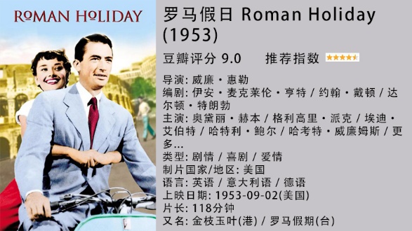 《罗马假日》讲述了一位欧洲某公国的公主与一个美国记者之间在意大利罗马一天之内发生的浪漫故事。影片由格利高里·派克和奥黛丽·赫本联袂主演,取得了巨大的成功,成为好莱坞黑白电影的经典之作。