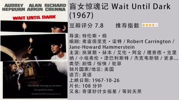 最后一部就是赫本的演技之作,《盲女惊魂记》讲述了盲女苏茜和丈夫下飞机时,代一位旅客保管一个绒毛玩具。那旅客一去不返。第二天,两名贩毒团伙成员追踪到苏茜家,他们利用她眼盲,一边冒充她丈夫的朋友跟她东拉西扯,一边到处寻找那个装满毒品的娃娃。