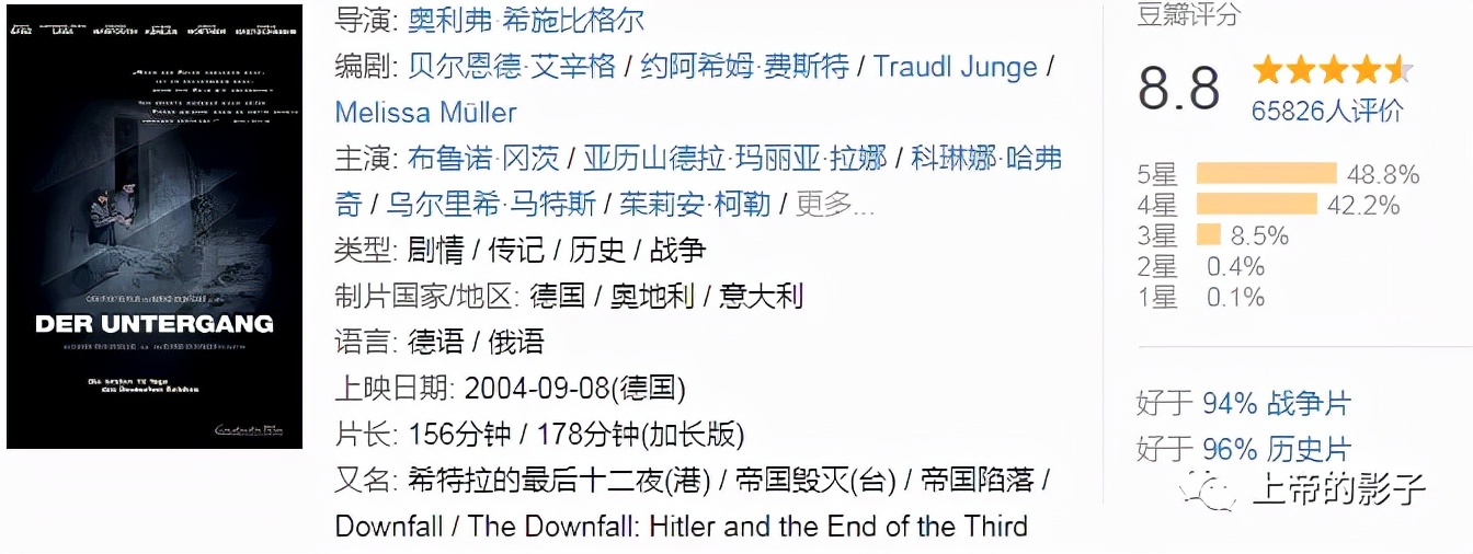“眼见他起高楼,眼见他宴宾客,眼见他楼塌了”,影片还原了希特勒最后的毁灭时刻,随着那声枪响,“我宣布:元首死了“,第三帝国也轰然崩塌,分崩离析。