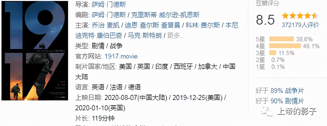 关于二战的电影有很多是传世之作,如《罗马,不设防的城市》《虎口脱险》《辛德勒的名单》《拯救大兵瑞恩》《钢琴师》《兵临城下》《敦刻尔克》等,相比之下,一战题材的电影确实少了很多,比较知名的有《大幻影》《西线无战事》《光荣之路》《战马》等。如今,《1917:逆战救兵》又为一战经典影片增添一员大将。