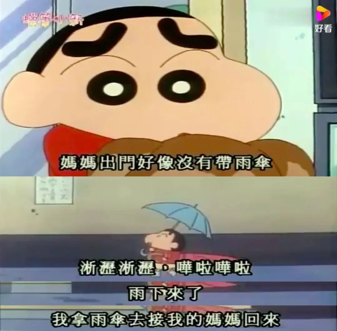 一天美伢瞒着小新一个人去了商场参加大甩卖,可是突然外面下起了大雨。本来还一个人在家发牢骚的小新想起来妈妈没有带雨伞,也流露出担心的目光。于是小新带上雨伞,踏上了为美伢送伞的道路。在商场门口,小新说的不是我来给你送伞,而是“我来接你回去。”看到母子相拥在一起,谁不会为这温馨的场面湿润眼眶。或许大家喜欢看蜡笔小新就是渴望那极致的温柔和那永远充满爱的家。