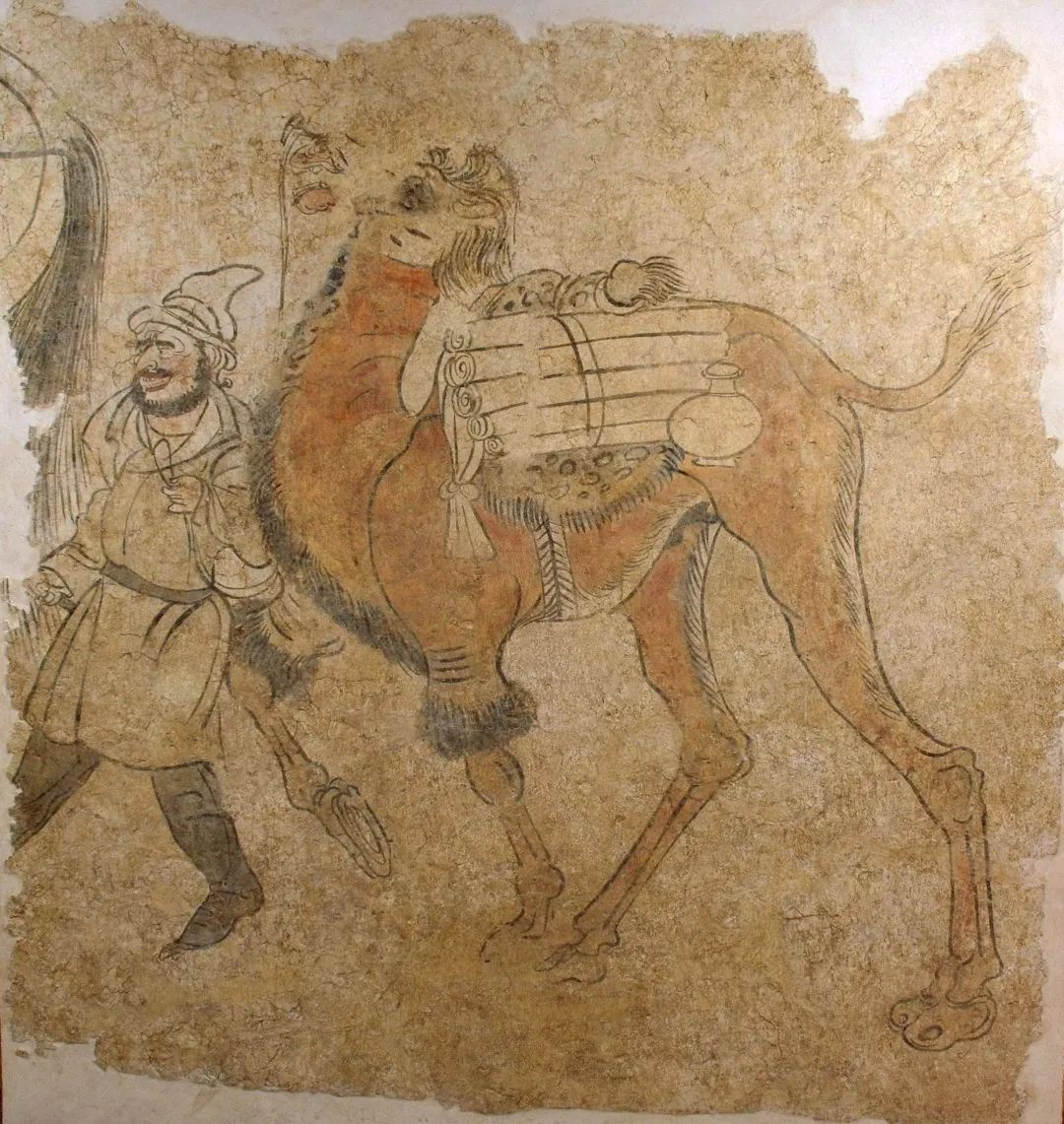 高大雄健的骆驼昂首挺胸、阔步前进;牵驼的胡人高鼻梁、深眼窝、络腮胡、唇红齿白,头戴高尖番帽,身穿翻领衣袍,小袖细衫,脚蹬尖勾鞋头。