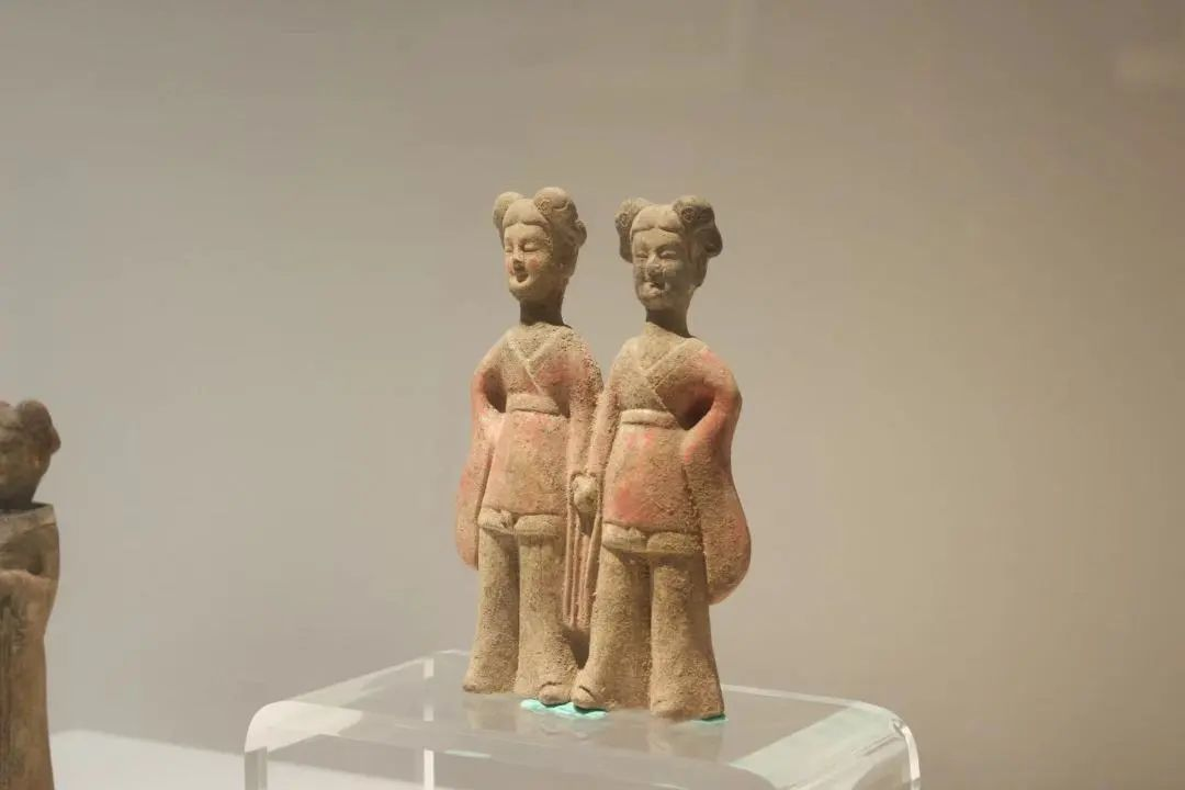 这是一件北魏彩绘双髻牵手女俑,出土于北魏重臣杨机的墓葬中,是很少见的少女牵手的形象。她们的发型是典型的未嫁少女的双挂髻,而穿着打扮则是典型的南北朝风格,上衣和下裳分开。上衣是交领广袖窄衣,一般里面还会有一件圆领的中衣作为内衬,下裳通常是百褶裙,外面还会有一件短一点儿的围裳。