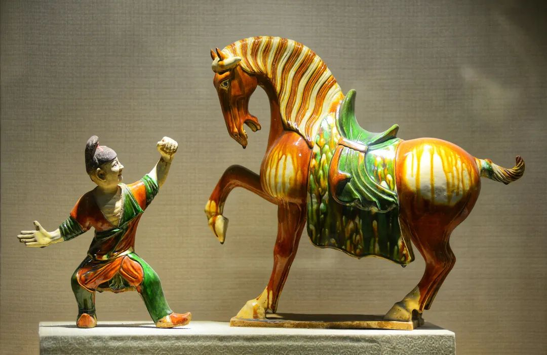 而在对外传播的过程中,外来文化对中国三彩的发展也产生了重要影响。比如,佛教题材、波斯造型特点在三彩器物的装饰中被广泛运用,既有中国本土特色又具有外来风情的三彩不断出现,三彩胡人俑、骆驼载乐俑等纷纷亮相等。