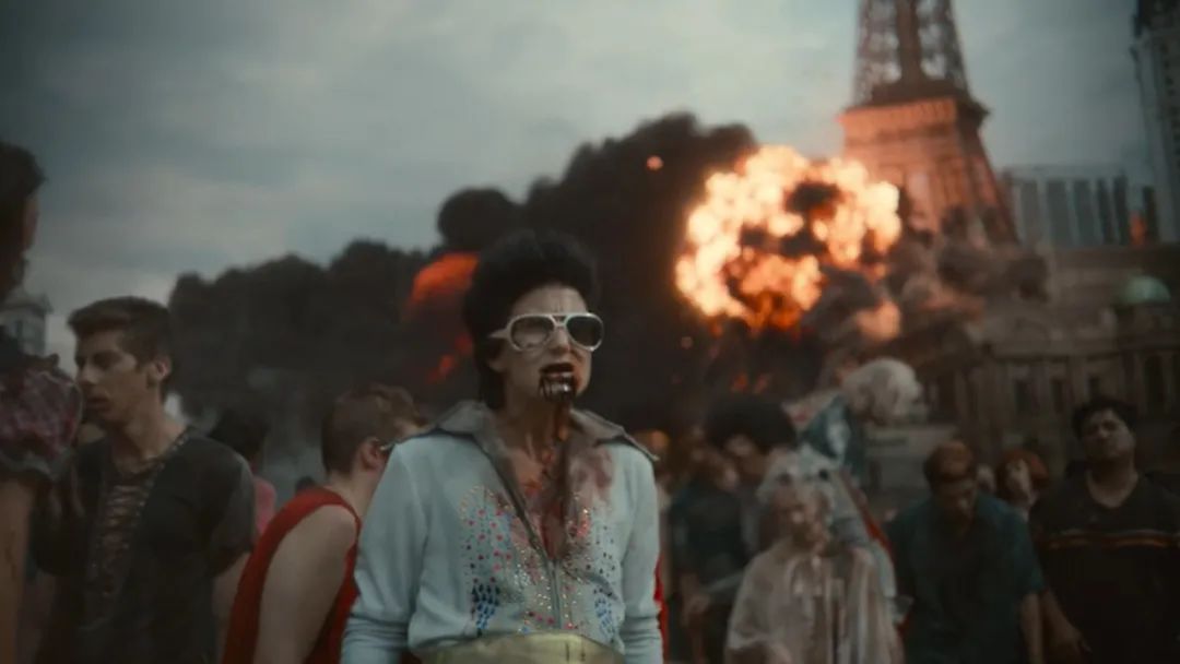 比如,丧尸王逃出生天,俯瞰脚下的拉斯维加斯时,音乐用的是猫王的《viva las vegas》(拉斯维加斯万岁)。