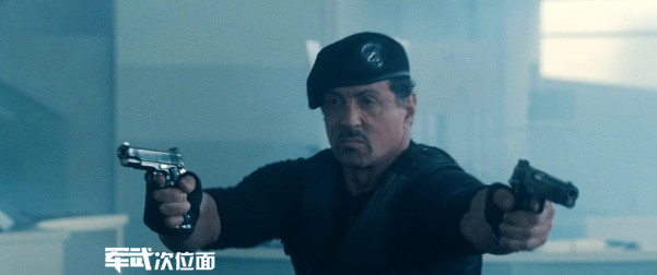 巴尼.罗斯在剧中使用双枪打击匪徒,这把手枪在第一部里也出现过,特点是握把上有敢死队的徽章,同样的徽章无处不在,包括巴尼的刀上