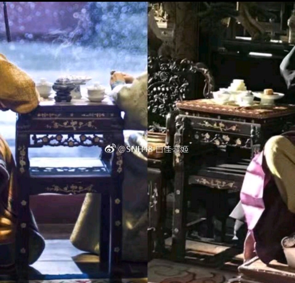 很多的道具也是抄袭《如懿传》,如这个雕刻了梅花雕花的桌子,且称:是因为这个妃子喜欢梅花,所以才会摆放的梅花雕花的桌子,《延禧攻略》盗用了桌子。
