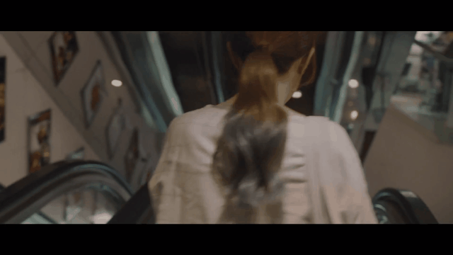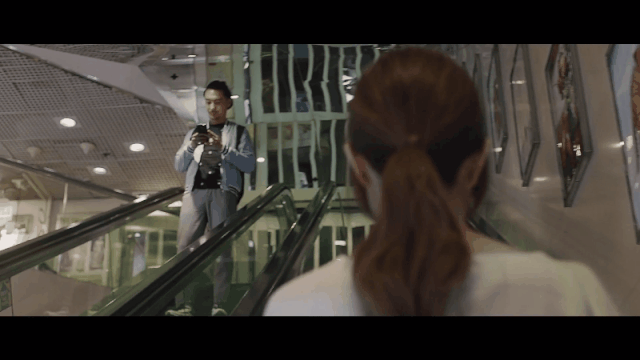 “我”犹如天神,从扶梯缓缓下降,先看向四周,再挥手致意,最后,程序性地把花递给自己的心上人。