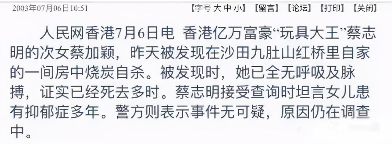 前面说到蔡先生有三女一儿,二女儿蔡加颖一直患有抑郁症,家庭的变故再加上街头巷尾的热议让她在2003年选择了烧炭自杀。