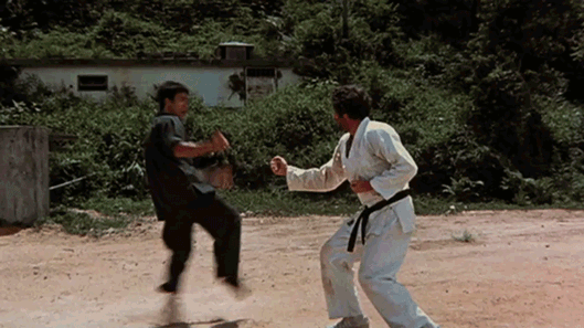 李小龙在电影《猛龙过江》(1972)中,试探对手,并引诱对手出招的影像