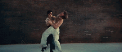 电影《猛龙过江》(1972)中,李小龙强健的倒三角身材的影像