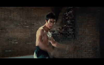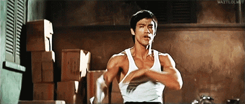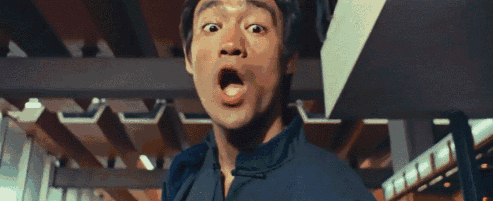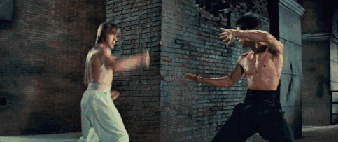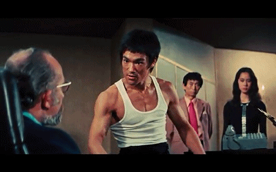 李小龙在电影《猛龙过江》(1972)中,打斗时夸张表情的影像