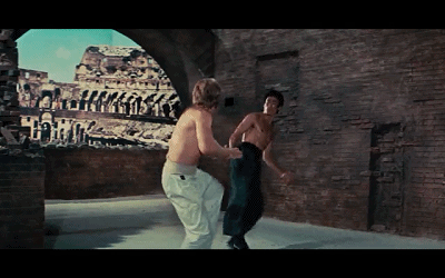 影片最后的大战安排在恢宏壮观的古罗马竞技场,李小龙和查克·诺瑞斯展开了一场真正的武者之间的较量。