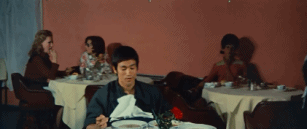 电影《猛龙过江》(1972)中,李小龙点了一堆汤后的影像