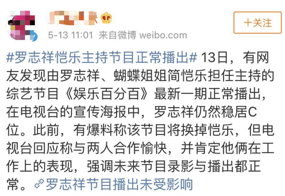 节目方之所以会保住两人的工作,据网友揣测可能是因为如下几个原因。其一就是为了节目的热度。虽然罗志祥和恺乐的事情近乎实锤,但两人在节目中的相处模式都会吸引不少吃瓜群众,相信只要节目一直让他俩主持,那关注事件走向的观众们就会持续收看。