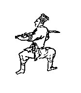 第二十架逆鳞势:两手肘部弯曲,剑柄靠近左膝,将手中之剑刺向前方偏左。若与下势连接,则进右脚,退左脚,左转体,且伴随剑向左旋转划圈包绕人体(即转出一圈之后,再进右脚迈向左前方,收剑于腹前一侧)。用此架应敌,可刺杀敌之喉颈。术语称作“探海捉鳖”势(如图20)。