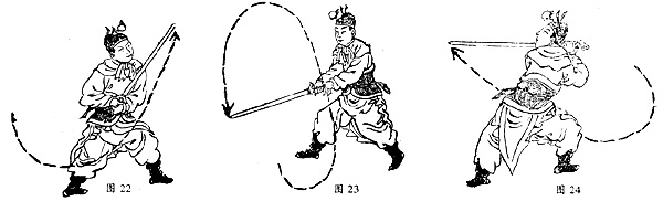 第二十三架凤头势:此架为点刺之法。即左脚踏前一步,手中之剑自右向后作一个小形绞花,随即向前点刺。右脚复进一步,剑再由左侧绞动一个小花向前点刺。接着,左脚再进一步,伴随剑由后翻转向前点击。如此三跃步三刺(点)剑,则为“凤头势”。若与下势连接,则退右脚,并将剑向右侧回收作定型。此招临阵之时,可上前击步揭刺或剪杀。术语称作“白蛇弄凤”势或“凤凰洗头”势(图23)。