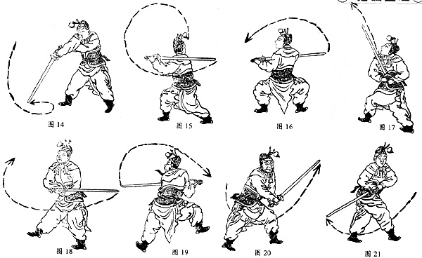 以上各法,由上往下有劈砍之法、由左向右或由右向左有平斩抹扫之法、由下往上有撩拨之法,更有挑点之势,朝夕而为,日久自见真功。
