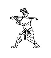 第十一架银蟒势;身势左偏右斜,两手带剑向右,右手在内,左手在外,剑尖朝上,提与鼻端相平,锋刃上下放置。若与下一招相连接,则退右脚,右转身腰,再进左脚,将剑高举并下砍。术语称作“掠杀四通”势。意为法顾四周八方。即向前则以左手左脚为重点,退后则以右手右脚为主(图11)。