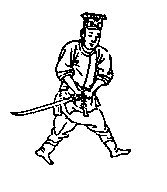 第三架左翼势:两手虎口朝后,肘尖夹紧(即将手中之剑尖向后),前进之时剑可直斫,也可斜砍。但须注意,启动时身与步要相随。由此势退左脚而进右脚,再转身向左则可变为下一势。所谓“左翼势”,即向左击杀也。其法能够上挑下压并直取敌家虎口穴位,令其弃械而成被动败局。术语称作“直符送书”势(图3)。