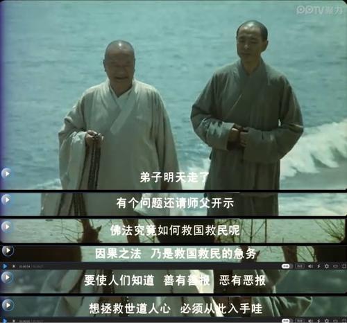 弘一法师和太虚法师在电影中的片段同样让人印象深刻,太虚法师认为只要把佛传播给每个人,人人称为佛,国自然都会成为佛国,人世间的纷争自然也会消除。他们认为他们虽然做着不同的事,但目标都是一致的,都是为了弘扬佛法,教化人心。
