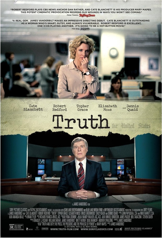 这部电影就是建立在这一真实事件的基础之上,主要人物为《60分钟》制片人玛丽·迈普斯(布兰切特饰),王牌播音丹·拉瑟(雷德福饰),以及事件调查研究小组(丹尼斯·奎德、伊丽莎白·莫斯及托弗·戈瑞斯饰)。影片展示了迈普斯她们是如何从一名退役中校bill burkett(斯泰西·基齐饰)手上得到这份备忘录的;以及他们在得到如此重磅的独家新闻之后是如何欣喜若狂,以至于没有费心先花一两周时间核实就发布了。整一事件以拉瑟和迈普斯卷铺盖走人告终,连带着很多相关人员都被炒了鱿鱼。他们老板andrew heyward(布鲁斯·格林伍德饰)对于当事人的“缺乏专业精神及对细节的审慎观审”而大为光火。