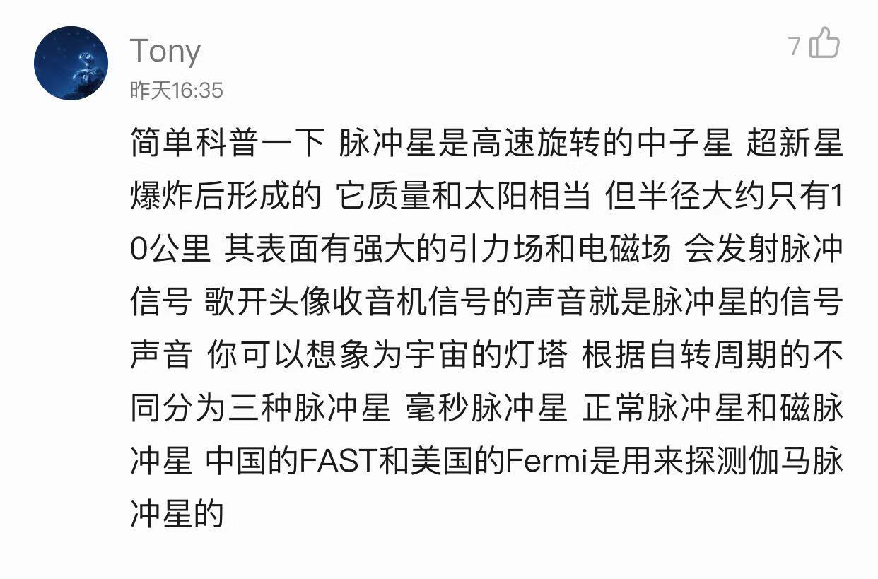 甚至还有网友,自发的为大家普及起关于脉冲星的知识。感觉这不仅是在听一首歌,更像是走进了天文馆,被知识包围。