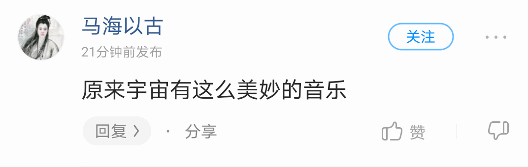 这可能是人类历史上第一首根据脉冲星的信号创作的歌曲,酷狗音乐脑洞大开将中国天眼2017年至2019年新收集到的100颗脉冲星融入到作曲中。歌曲一上线,歌曲评论区就炸锅了,有祈福的,有许愿的,还有科普教育的。各种新媒体平台也出现了一批很有想法的评论。