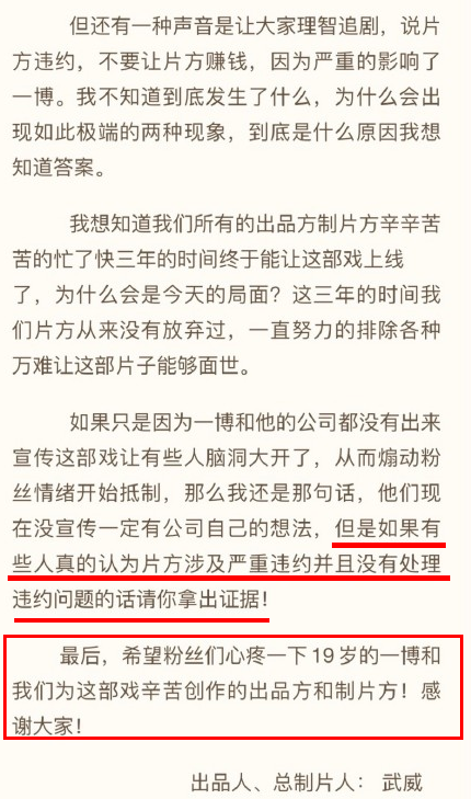 咱们《我的奇怪朋友》制片人武威就看不下去了,微博发了一篇“写给一博粉丝的一封信”,也算是给王一博粉丝一个交代↓