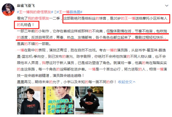 最后说一句,《我的奇怪朋友》我看过了,还不错哦,用粉丝的话说:这部剧绝对是给粉丝的惊喜,是20岁的王一博送给摩托小区所有人的礼物。