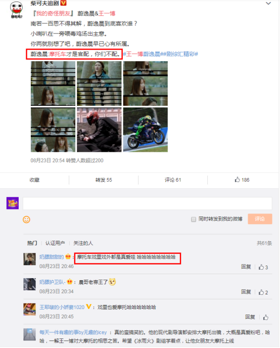 最后说一句,《我的奇怪朋友》我看过了,还不错哦,用粉丝的话说:这部剧绝对是给粉丝的惊喜,是20岁的王一博送给摩托小区所有人的礼物。