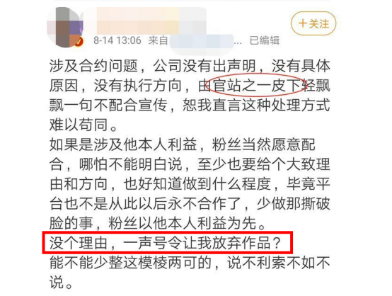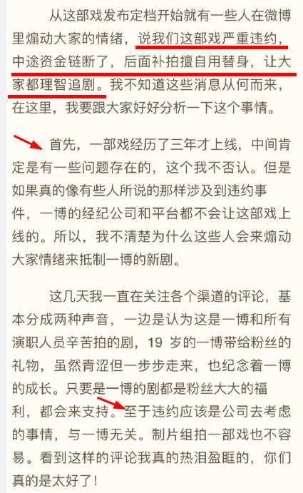 怀念完19岁那个拼命想演好角色的王一博,武威接着解释了该剧延播的原因(自己也坦白了:存在问题),并委婉的表明了“违约”这个说法的不准确性:如果有我们违约的证据,请交出来,否则别逼逼叨,毕竟《我的奇怪朋友》是成千上百人的心血之作。↓
