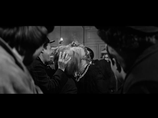 一个月黑风高夜,锅炉工带了一群人来参观象人,从中收取钱财,就像马戏团的老板拜斯一样。这一段再现蒙太奇手法,各种镜头一一闪现——众人看象人时恶心厌恶的表情,妓女被迫和象人接吻,男人们放肆的嘲笑声,欺压象人的得意嘴脸,强迫女人与象人同睡一床,往象人身上倒酒,等等……