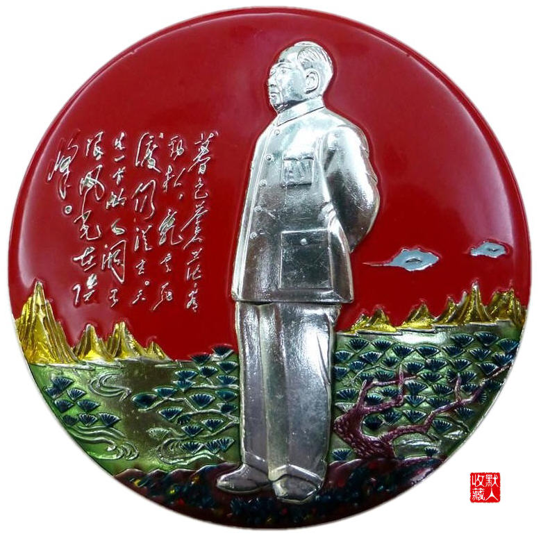我们可以看到“双全”的设计堪称文革像章中的一面旗帜,其诗情画意、栩栩如生的设计一直被大家津津乐道,峻秀的山水和苍劲的松柏宛如人间仙境,缥缈的景致之中主席雄伟高大的形象显得十分亲切而真实,看主席从容自若,背手而立,一览祖国山河,正前方毛主席手迹“暮色”诗词如神来之笔,补白的同时也升华了主题,整个画面构图巧妙而不失严谨,色彩艳丽而不失自然,惟妙惟肖之间构成了一幅壮美的人物诗画。