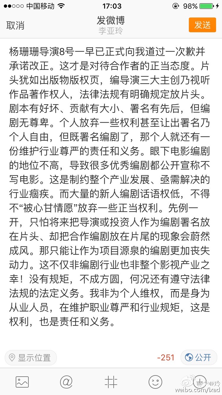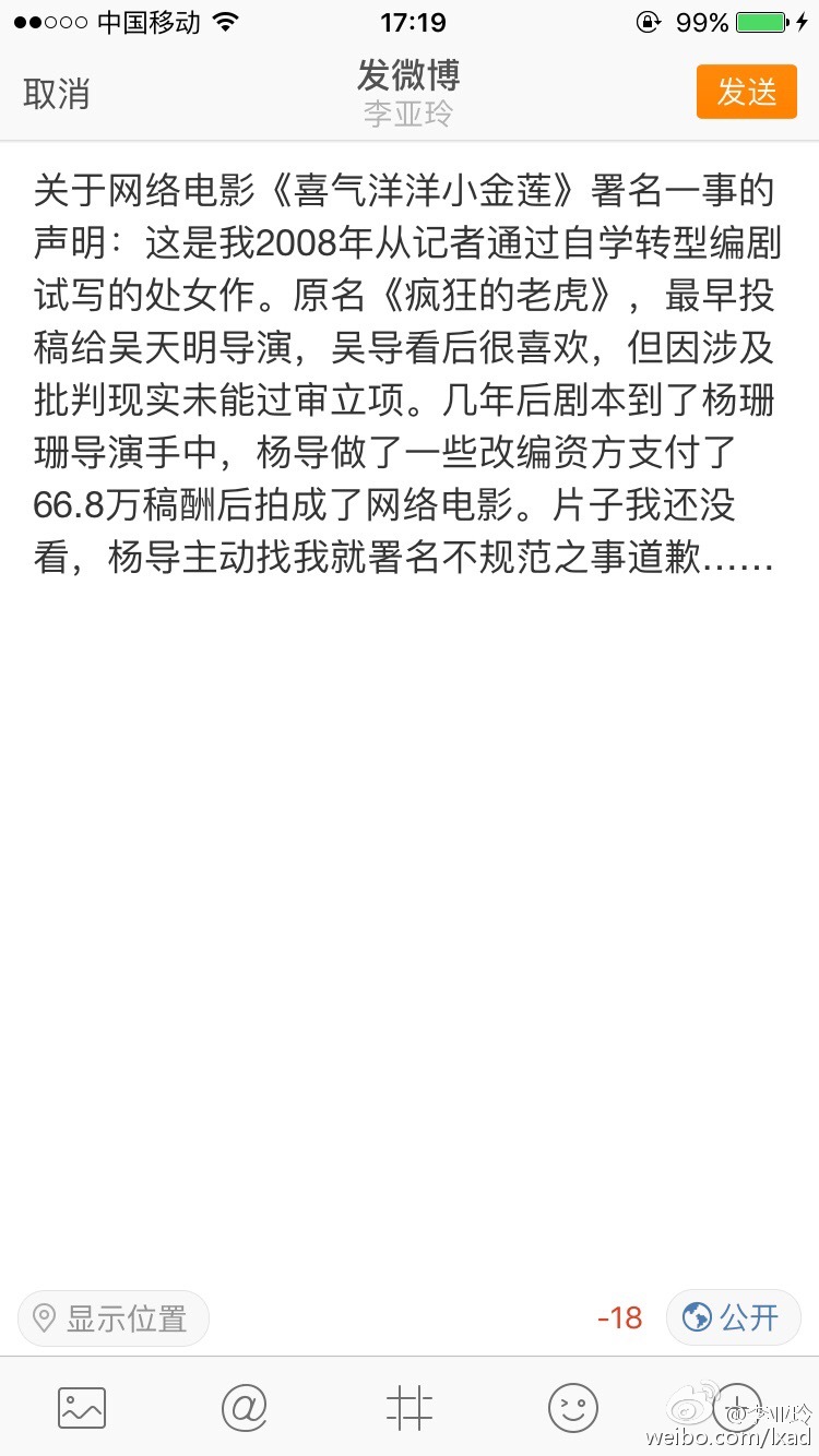 关于我的网络电影《喜气洋洋小金莲》署名一事的声明:这是我2008年转型做编剧写的第一个剧本处女作。从构思到完稿一共三天,原名《疯狂的老虎》,最早投稿给吴天明导演,吴导看后很喜欢,但因涉及批判现实未能通过审查。投资方在支付了66.8万稿酬以后由杨珊珊导演拍成了网络电影。附我当年的剧本大纲。