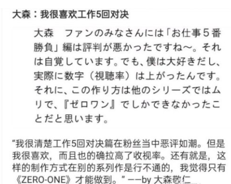然而面对商战篇这可以称得上“神回”的转折点,制片人大森敬人还表示:我很喜欢这五回商战对决篇,虽然它在粉丝当中恶评如潮,但也确实拉高了《假面骑士01》的收视率,这是其他系列作品中所做不到的。