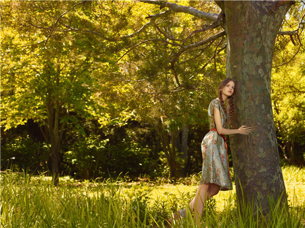 这一季的设计虽然以自然以丛林为背景,但灵感既不来自《爱丽丝漫游仙境》,也不来自《绿野仙踪》,灵感来自法国电影《甘泉玛侬》里那个随着羊群在山间奔跑的任性的野丫头,为父报仇最终又选择了宽恕的艾玛·纽贝阿——一个女孩懂得了爱就会成为女人的故事。