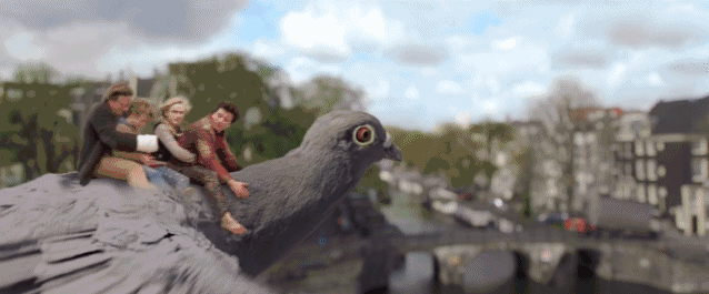 一家人骑鸽子在杜莎夫人蜡像馆上空滑翔