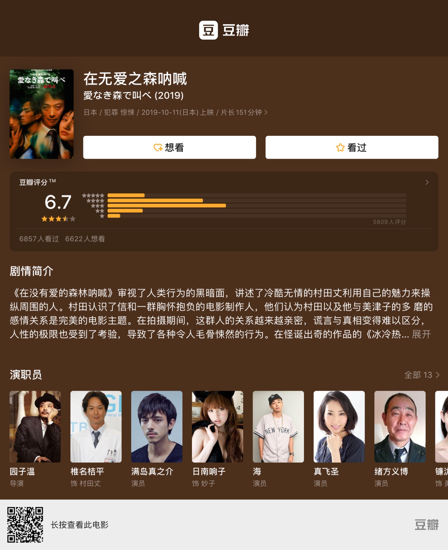- ps.《在无爱之森呐喊》最近推出了剧版《在无爱之森呐喊:深入密林》补充了不少细节,将电影版151分钟增加到282分钟,对人物刻画也更加细腻,感兴趣的朋友快去看看吧~