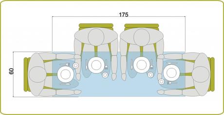这里需要记住一些数字:普通餐椅宽度在0.4-0.45米左右,那么一个人呈坐姿就餐,标准占宽为0.7米。而最小占用宽度不能小于0.6米,这时候就餐者双肘就要尽量靠近身体,防止干扰到他人。
