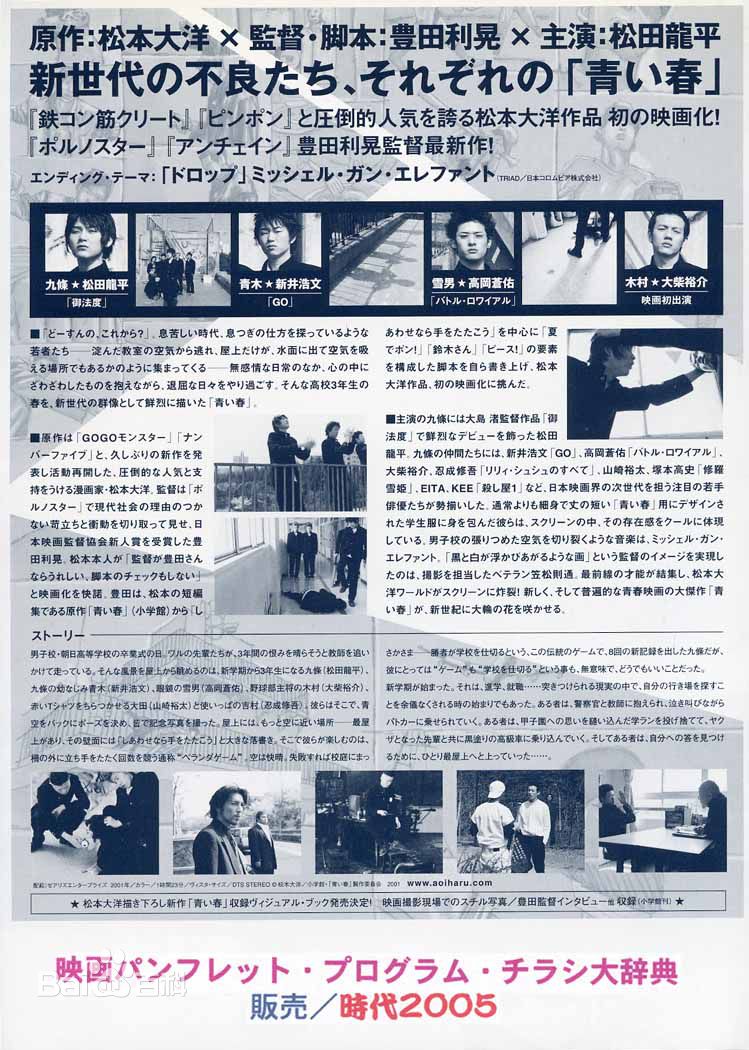 九条(松田龙平饰)和他的兄弟们一起从小玩到大,在刻板单调的学校里终日无所事事,整天结党打架,争抢地盘。因为九条够胆又够狠,死党们就当他是偶像兼大哥,誓死追随。高三的这些男孩又找到了新的游戏,在朝日男子高校的最高楼层上,谁倒骑在天台栏杆外拍掌次数最多(而没有不幸掉下高空),谁就是学生里的老大。