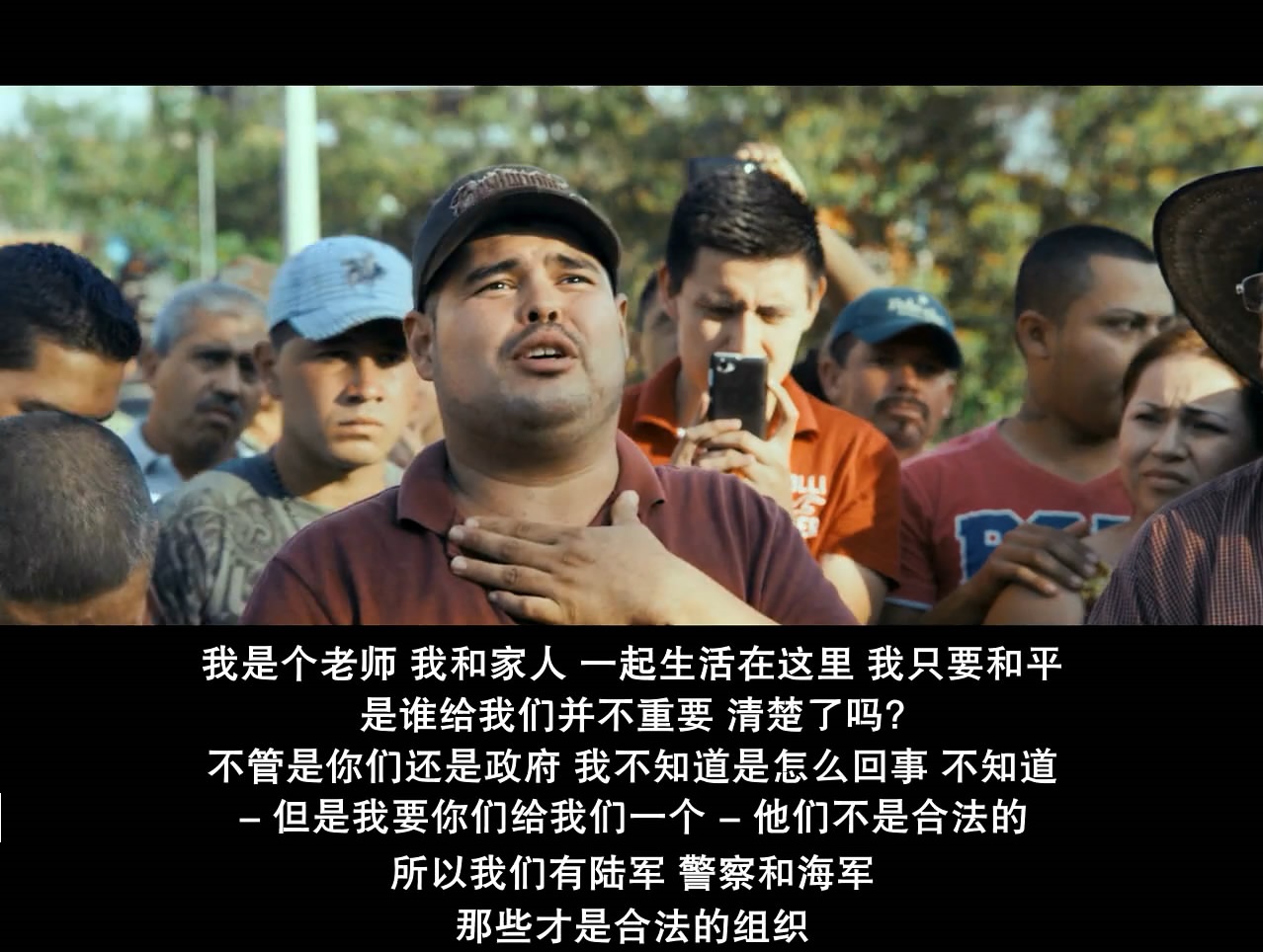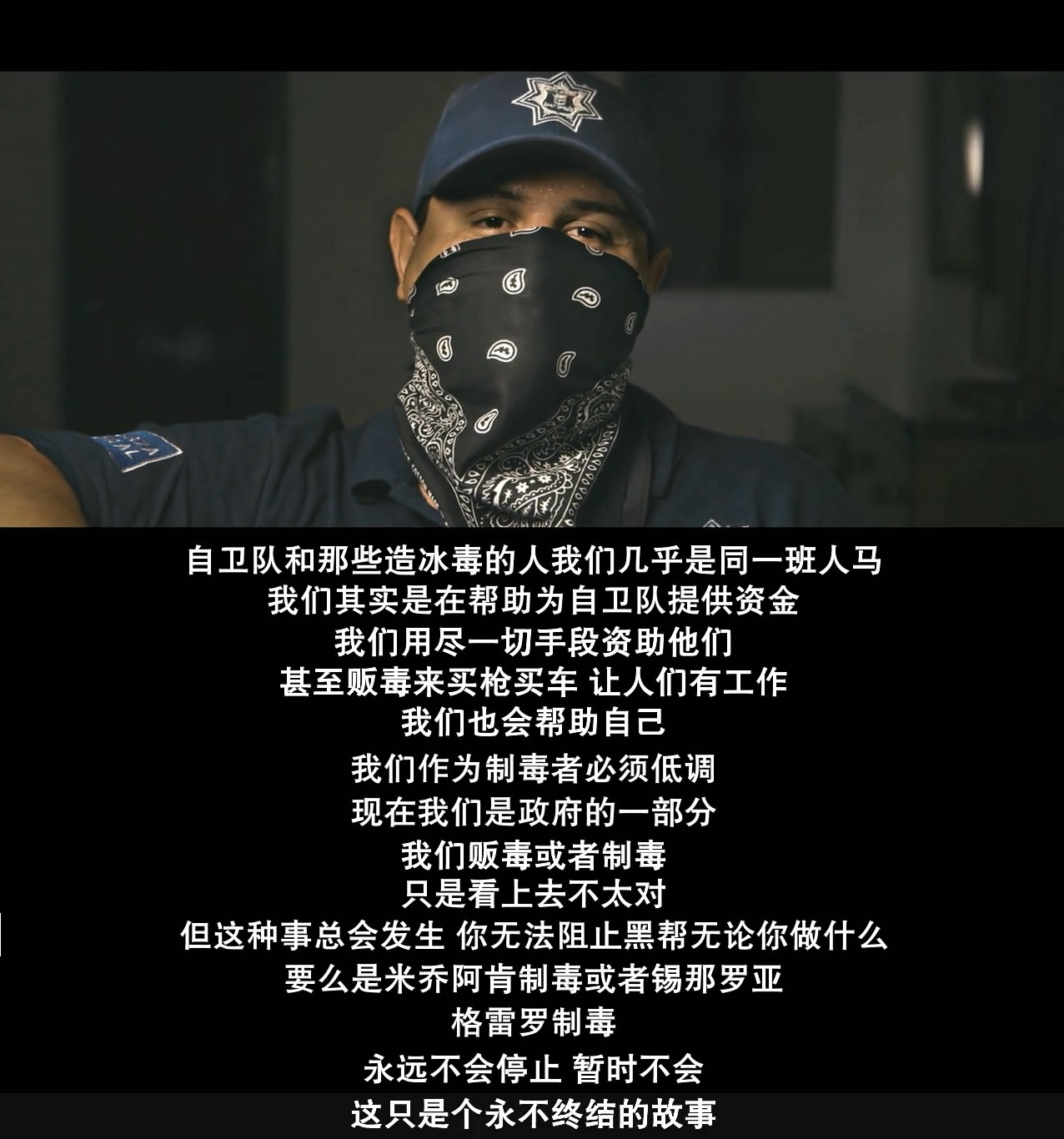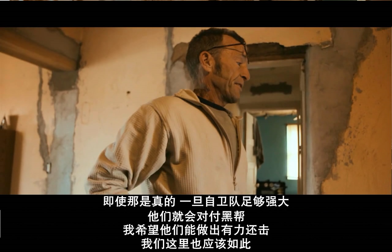 义务警察的反面是媒体,而自卫队的反面是墨西哥政府,比媒体更恐怖的是,墨西哥所谓的“国家机器”与黑帮勾结之紧密犹如水乳相融,片中村民称之为“有组织的犯罪”,