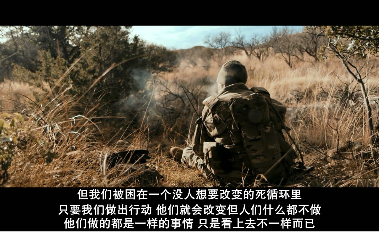 但就是欲望动摇了对正义的信仰,从而形成了善恶循环,可以说,墨西哥自卫队领袖米莱雷斯相比于美国义务警察领导蒂姆有着天壤之别,蒂姆是个孤独的斗士,而米莱雷斯是个失败的革命者,曾经为正义而战的两人,都深感“循环”之根深蒂固,对此,米莱雷斯说,