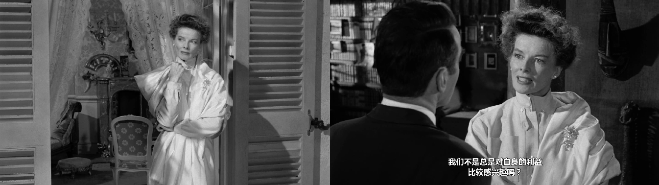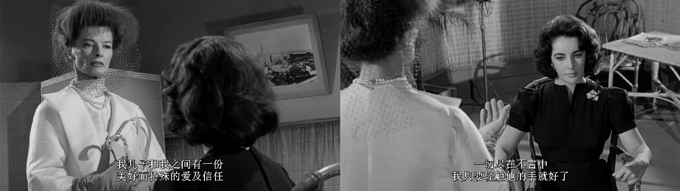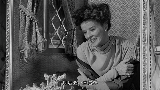 饰演维纳波夫人的凯瑟琳·赫本,对维纳波夫人的呈现具有着超越时代的精确性。一方面,她抓住了其性格精髓:高傲强势、刚愎自负又不失典雅节制;另一方面,她将维纳波夫人的悲剧性寓于人物的一言一行,她对儿子的控制欲、对“名誉”的依附性,不仅让她变得极端病态、冷酷、残暴,虚荣的背后,是其作为陈旧礼教殉道者、牺牲品的悲剧。因此,她的神态在傲慢之余,总是闪烁着伤感与脆弱。