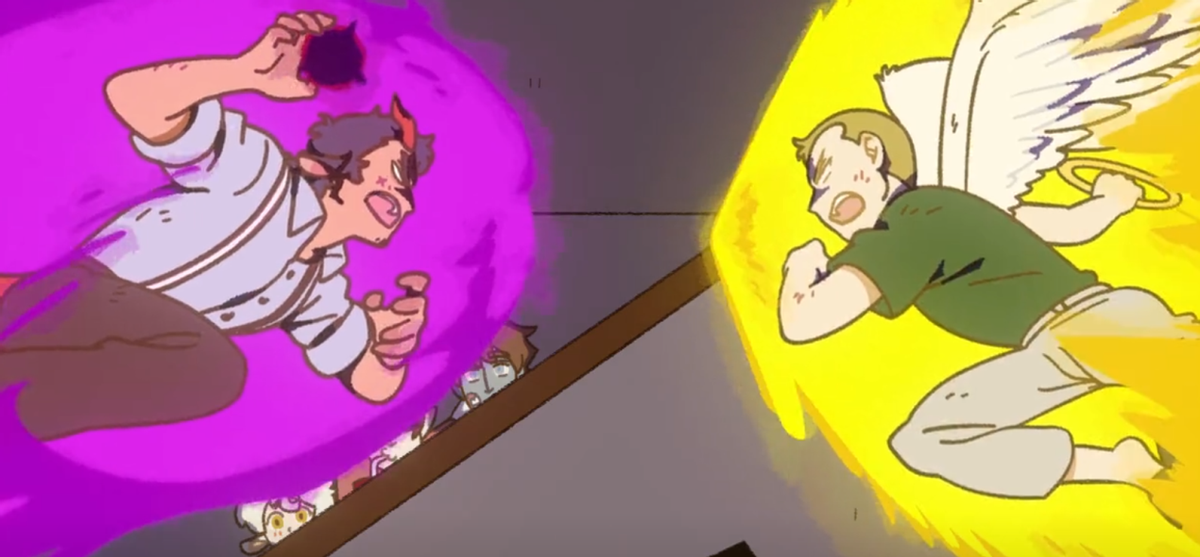 发出哀嚎的男人正是来自地狱的年度优秀员工恶魔尼克,而让这个男人崩溃的罪魁祸首,正一脸无辜地站在电视机前,他便是来自天堂的模范教师林恩!