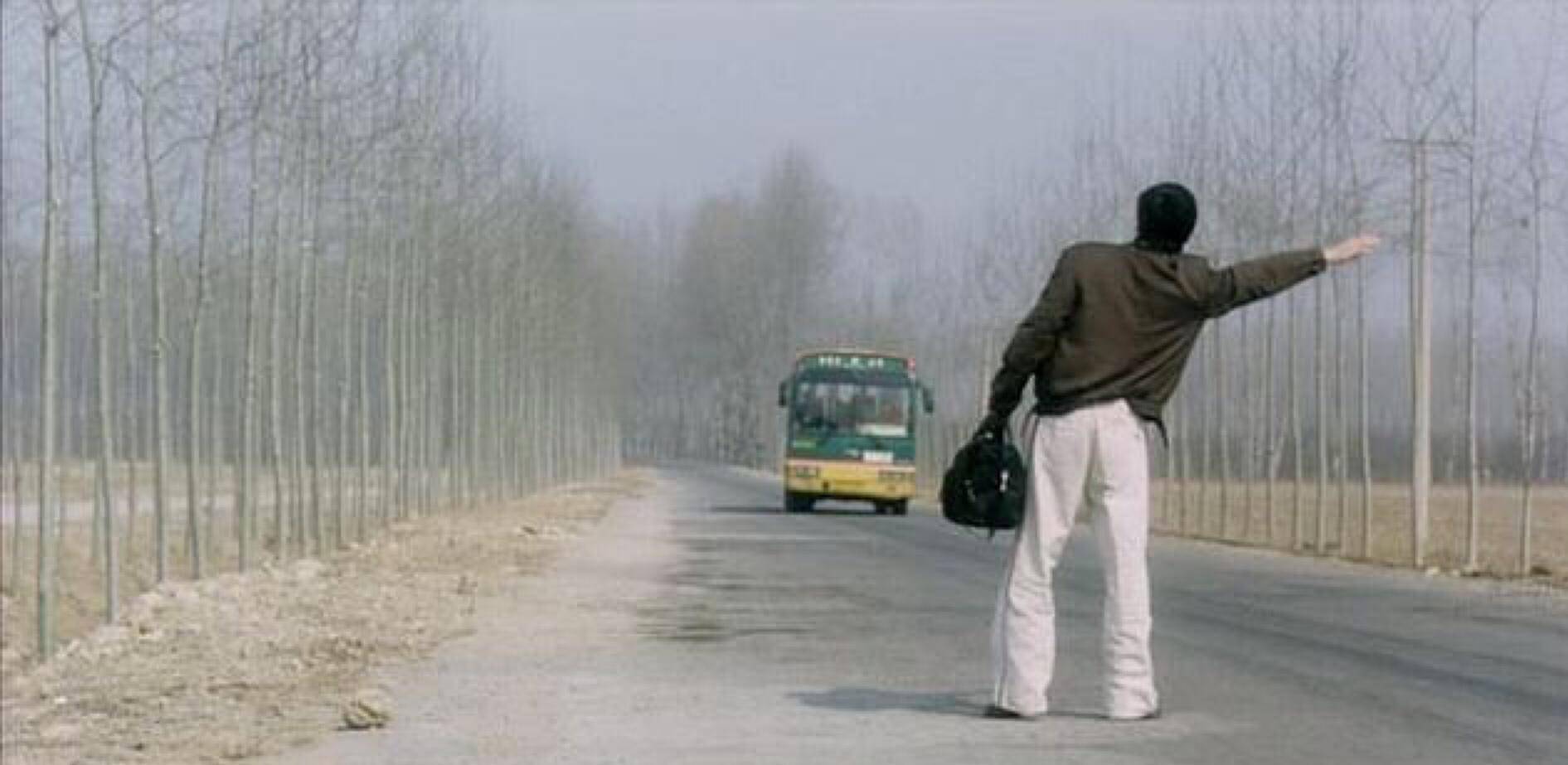 影片一开始用一个简单的固定镜头瞬间就突出了该片荒凉的氛围:一望无际的原野,蜿蜒而来的公路,树木和草都已枯黄,没有任何生机。男青年本在路边等车,镜头快摇过车,青年上车了,他简短的同女司机对话后,车继续向前平缓的行驶。