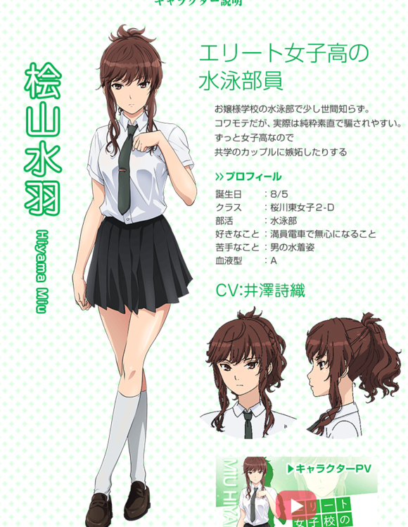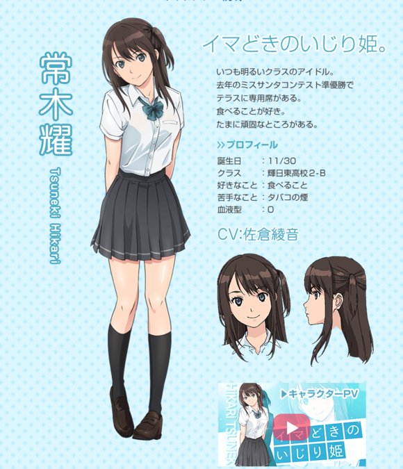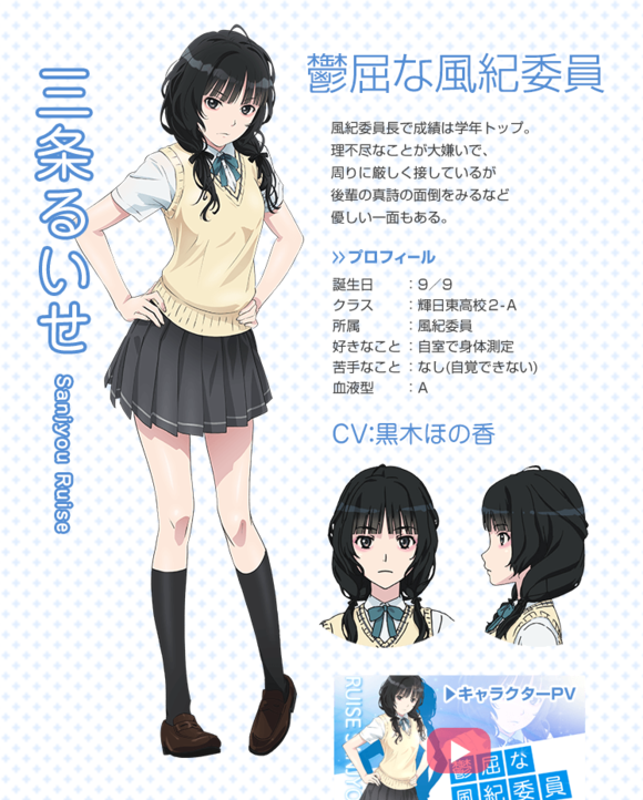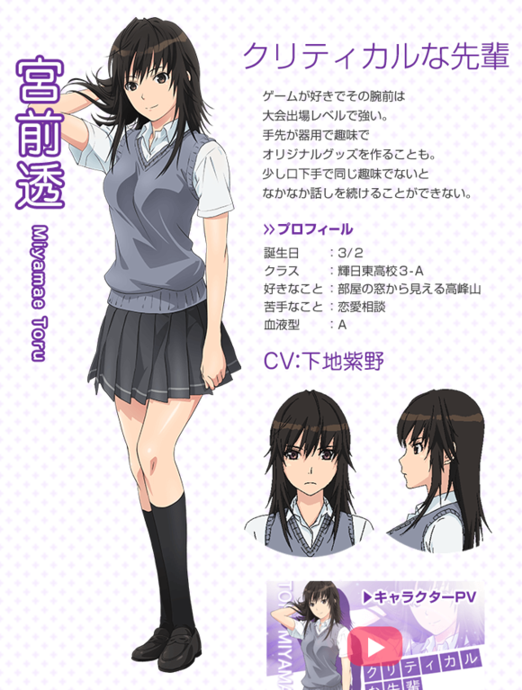 和背景宣传图那文艺少女气质不同,实际是个成天挂着深深的黑眼圈摆着阴沉脸的没自觉女子,同年级的风纪委员,打结的头发和熊猫似的双眼以及一张苦瓜脸,感觉是个严肃呆板的角色, 大胆yy一下可能是个病娇,咄咄逼人的态度却被男主反杀的典型剧情?