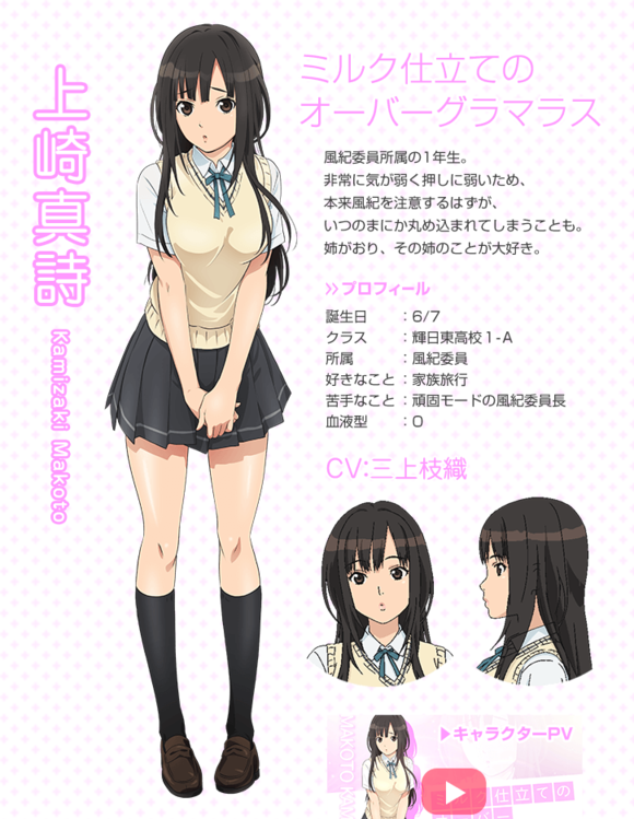 年下学妹,风纪委员成员之一,pv里感觉还是比较活泼擅长卖萌的家伙,似乎不擅长应付自家的委员长,弱气受的属性貌似是最容易攻(推)略(倒)的一个?