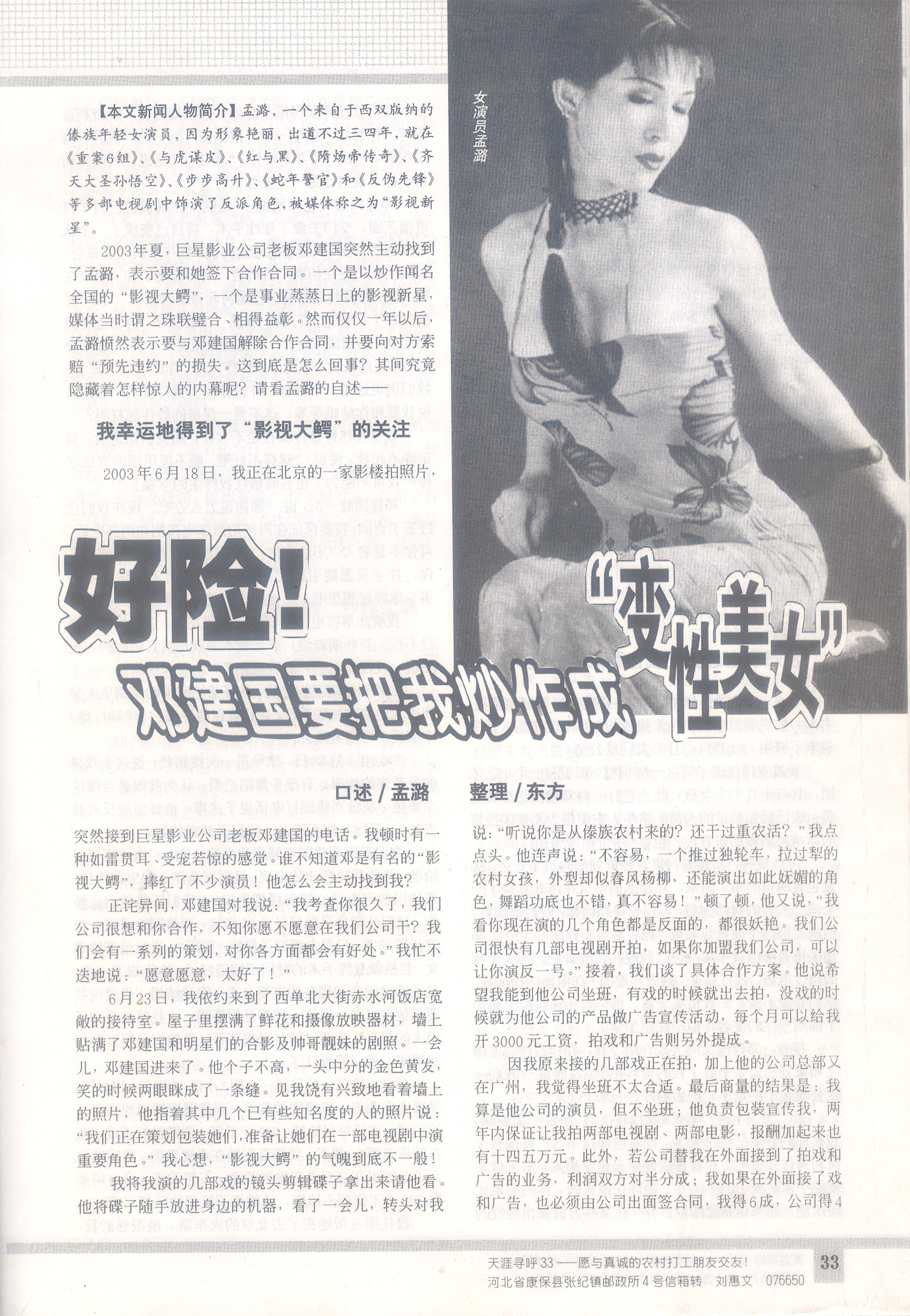 最终,因为各方面的原因,这个炒作没能实施,该演员也并没有得到邓建国在与她签的合同中承诺的拍戏机会,而且因为与邓建国签了合约而失去了许多其他的机会。当希望与邓建国解除合约时,却又一直找不到他,导致自己错失其他机会,甚至一度维持生活都成了问题……她非常后悔与邓建国签约,因此通过媒体进行报料,提醒和自己一样有影视梦的年轻女孩吸取自己的教训。