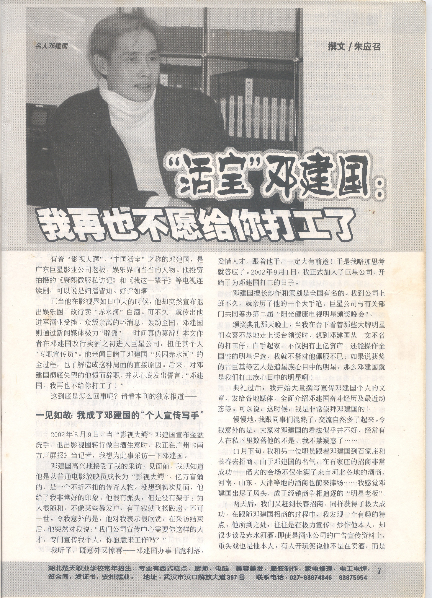 离开之后,由于希望邓建国能在严酷的现实面前认识到错误,迷途知返,所以,我把自己为他打工以来的所见所闻、所感所想,写成一篇文章《“活宝”邓建国,我再也不愿为你打工了》,发表在当时非常有影响的知音报刊集团子刊《打工》杂志上,通过详实的事例,提醒他要改变以往只炒作自己、不关心员工权益和客户利益的作法。